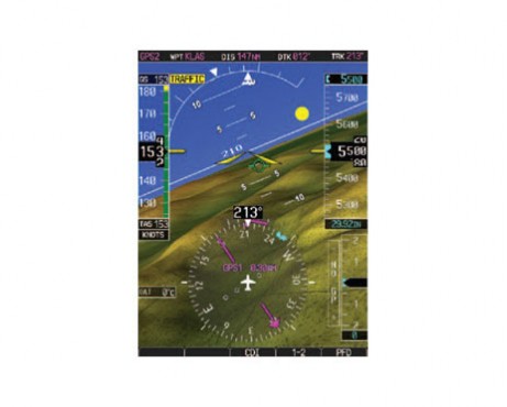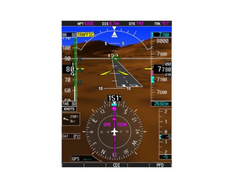 On the left-hand side, the PFD consolidates all primary situational information regarding your aircraft’s position, speed, attitude, vertical rate, altitude and flight progress. For added visual orientation, a scaled version of Garmin’s SVT™ Synthetic Vision Technology is also available as an upgrade option – creating a 3-D “virtual reality” perspective view of flight and enroute terrain features.